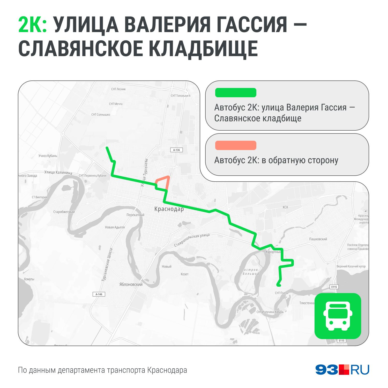 - №2К «Ул. им. Валерия Гассия — Славянское кладбище» — автобус следует по стандартному маршруту №2, после чего поворачивает на улицы Бабушкина, Красных Партизан, 2-ю Линию и 4-ю Линию. В обратном направлении путь изменяется: с Красных Партизан транспорт направляется на Гаврилова, затем на Красную и Северную.