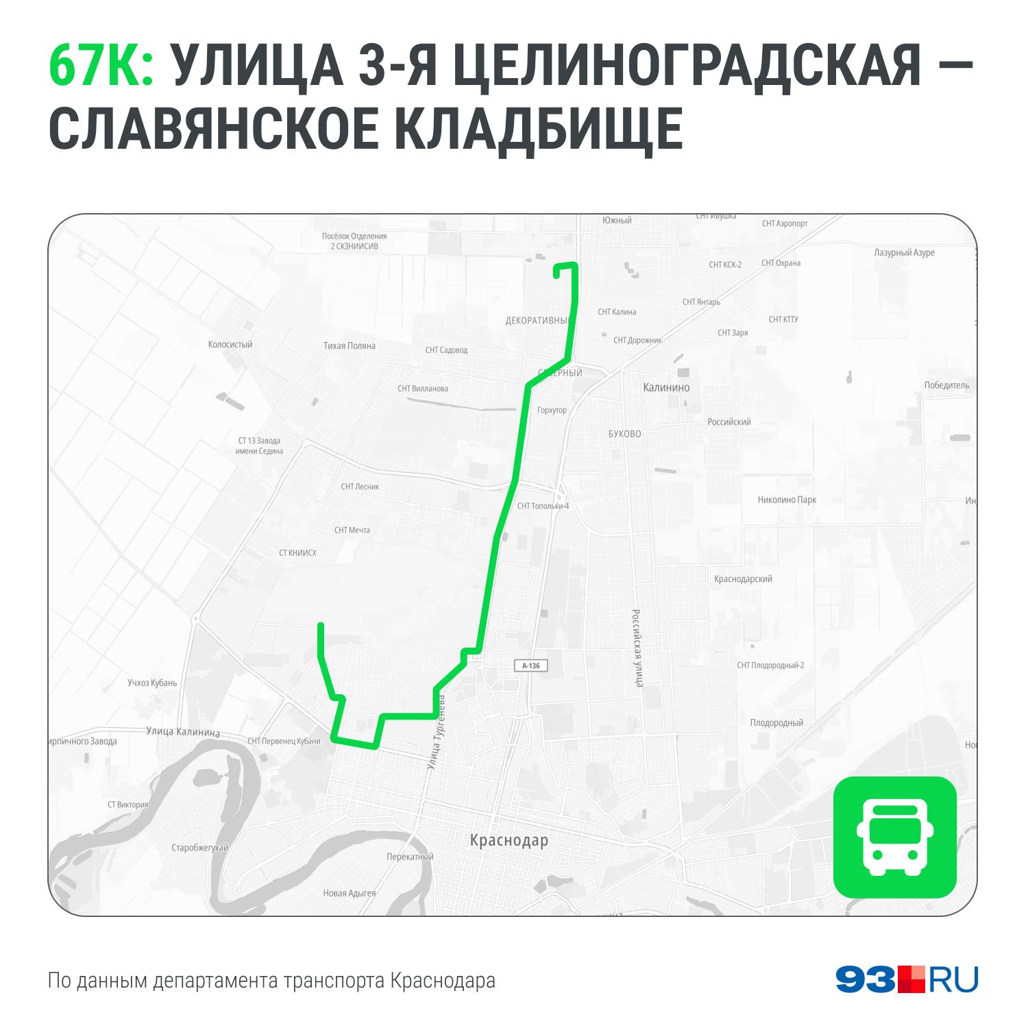 - №67К «Ул. 3-я Целиноградская — Славянское кладбище» — транспорт из Молодежного микрорайона движется по маршруту №67 до улицы Тургенева, затем поворачивает на Атарбекова, Красных Партизан, 2-ю Линию и 4-ю Линию.