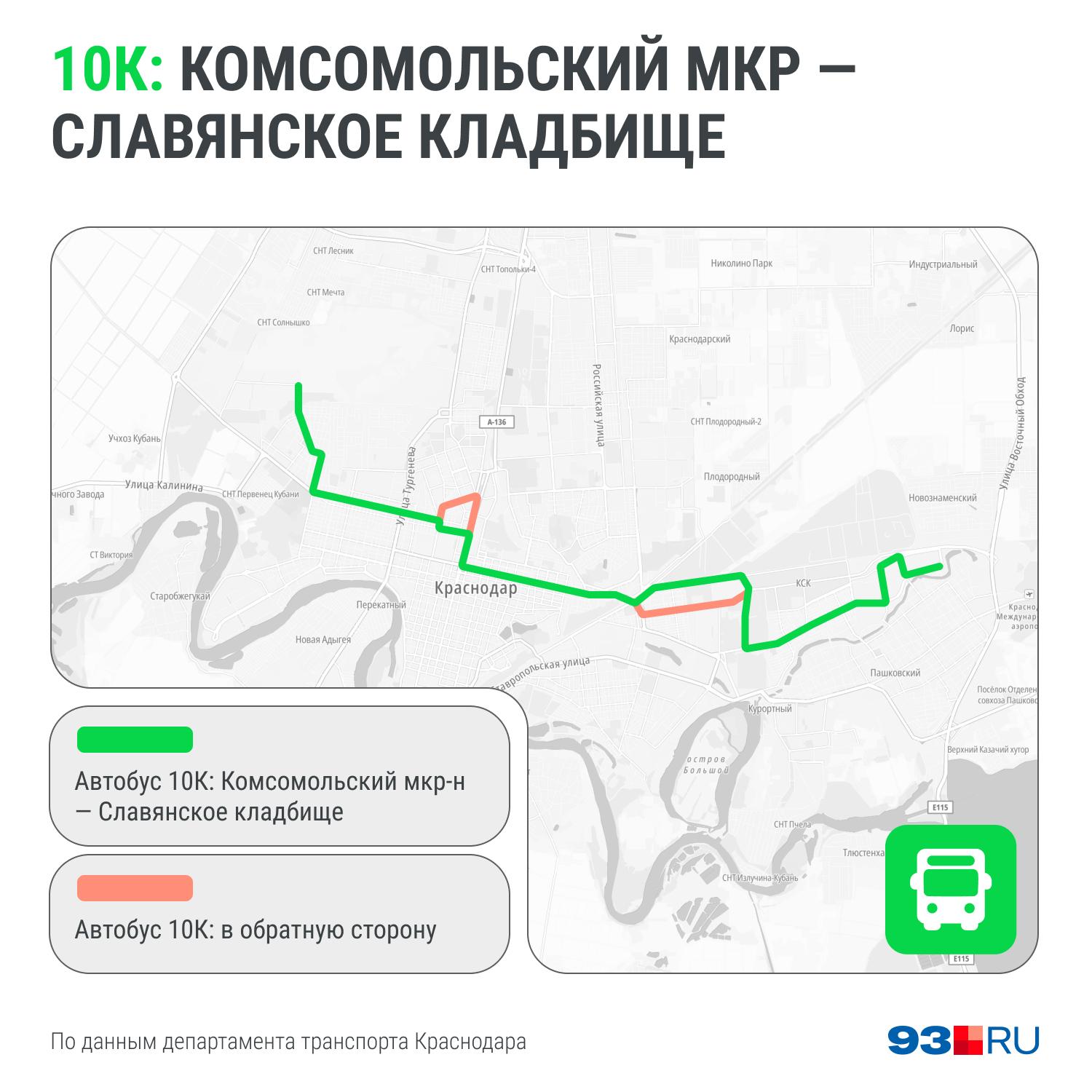 - №10К «Комсомольский микрорайон — Славянское кладбище» — маршрут в основном соответствует автобусу №10, но на Красных Партизан поворачивает на 2-ю Линию и далее к кладбищу. Обратно автобус едет по Гаврилова, Красной, Северной и Уральской в Комсомольском микрорайоне.
