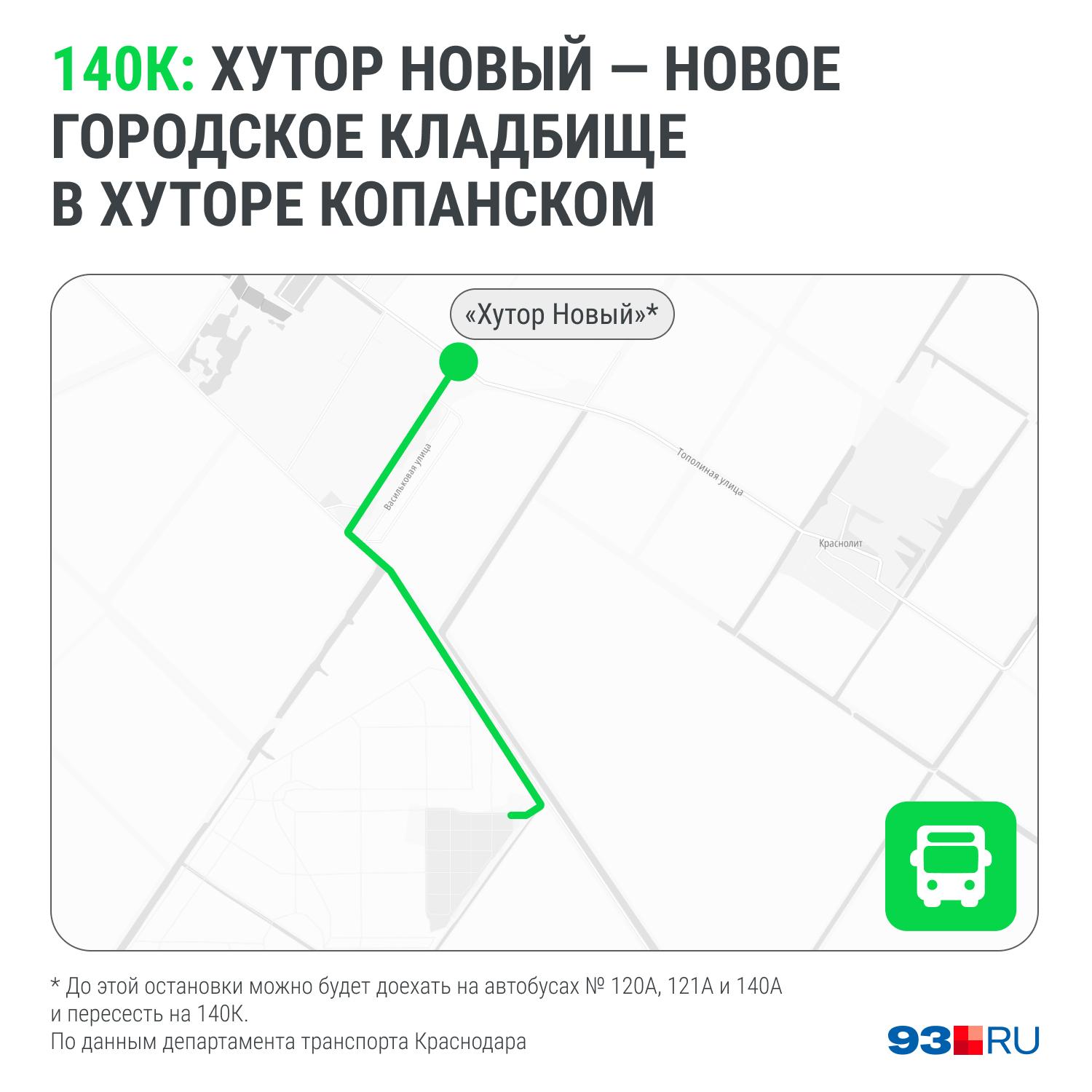 - №140К «Хутор Новый — Новое городское кладбище, хутор Копанской» — этот автобус курсирует от остановки «Хутор Новый». До нее можно добраться на автобусах №120А, №121А и №140А.